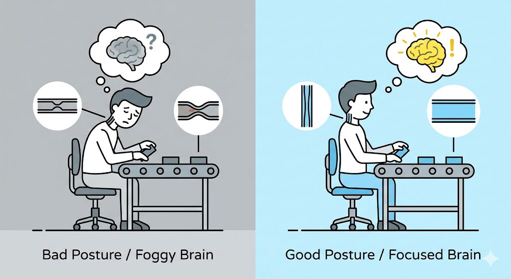 理学療法士として、これまでに何千人ものお体を診てきて確信しているのは、体の痛みは単なる感覚の問題ではないということです。物理的に、脳の働きをストップさせてしまうんです。製造現場では、どうしても中腰の姿勢や、同じ動作の繰り返しが多くなりますよね。そうすると、特定の筋肉がずっと緊張して硬くなり、周りの血管をギューッと圧迫します。血管が圧迫されると、血液の流れが悪くなる。特に、首や肩の筋肉が固まると、脳に酸素を送る大事なルートが狭くなってしまうんです。