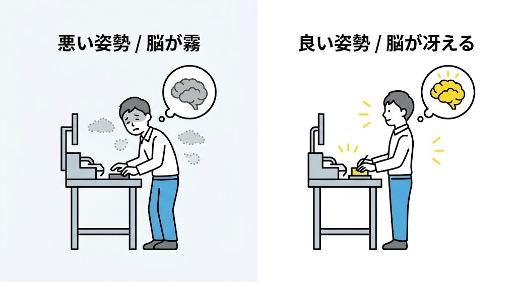 腰が痛い、肩が重いと感じながら作業している社員は、常にその痛みに意識を奪われています。これは、いわば脳のメモリの半分を痛みの処理に使ってしまっているような状態なんです。本当なら100の力で集中できるはずなのに、痛みというノイズのせいで、集中力が途切れがちになる。ネジを一本締め忘れる、数値を読み間違える、わずかな異変に気づかない。これらは本人の不注意ではなく、体が悲鳴を上げているせいで脳が働けなくなっているからなんです。一つのミスが製品の回収や、お客様からの信頼を失うことに繋がる怖さは、社長が一番よく分かっていらっしゃるはずです。