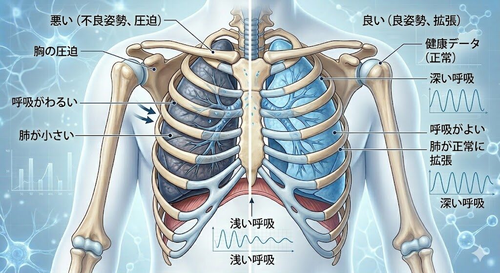 たとえば、現場での重労働や長時間の同一姿勢は、身体のバランスを崩し、反り腰や強い猫背といった不良姿勢を慢性化させます。この不良姿勢が定着すると、胸郭と呼ばれる肋骨の広がりが物理的に制限されてしまいます。胸郭が広がらないということは、呼吸が極端に浅くなるということです。